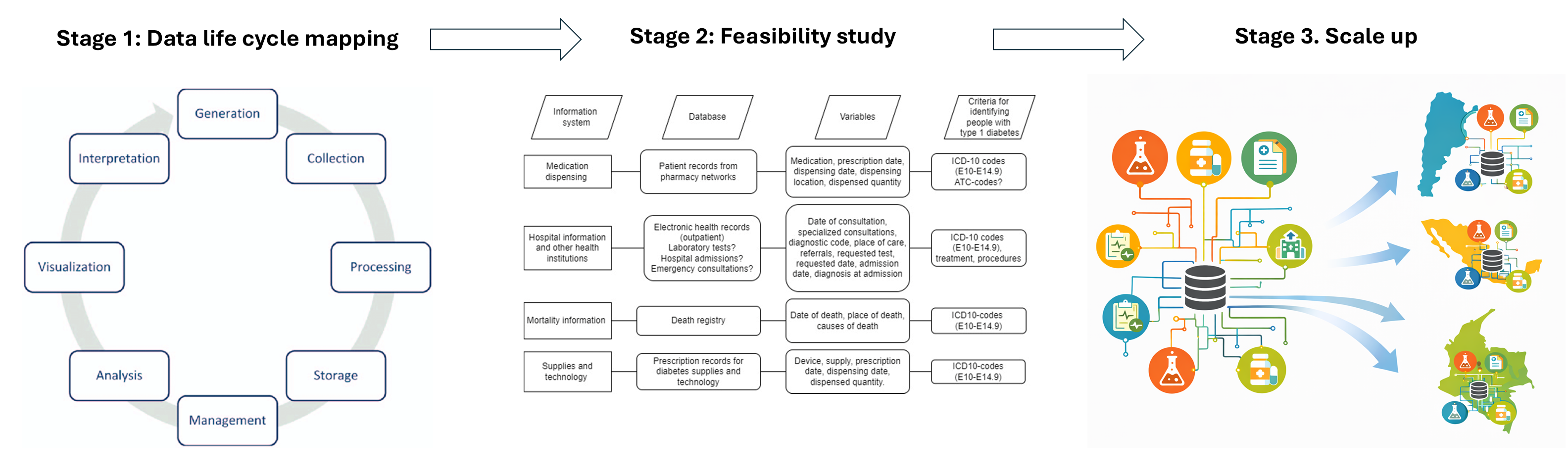 The LatinDiab project is conceptualized as a multi-country, mixed-methods implementation research project over the course of four years. The project will be implemented in three stages across Argentina, Mexico, and Colombia.